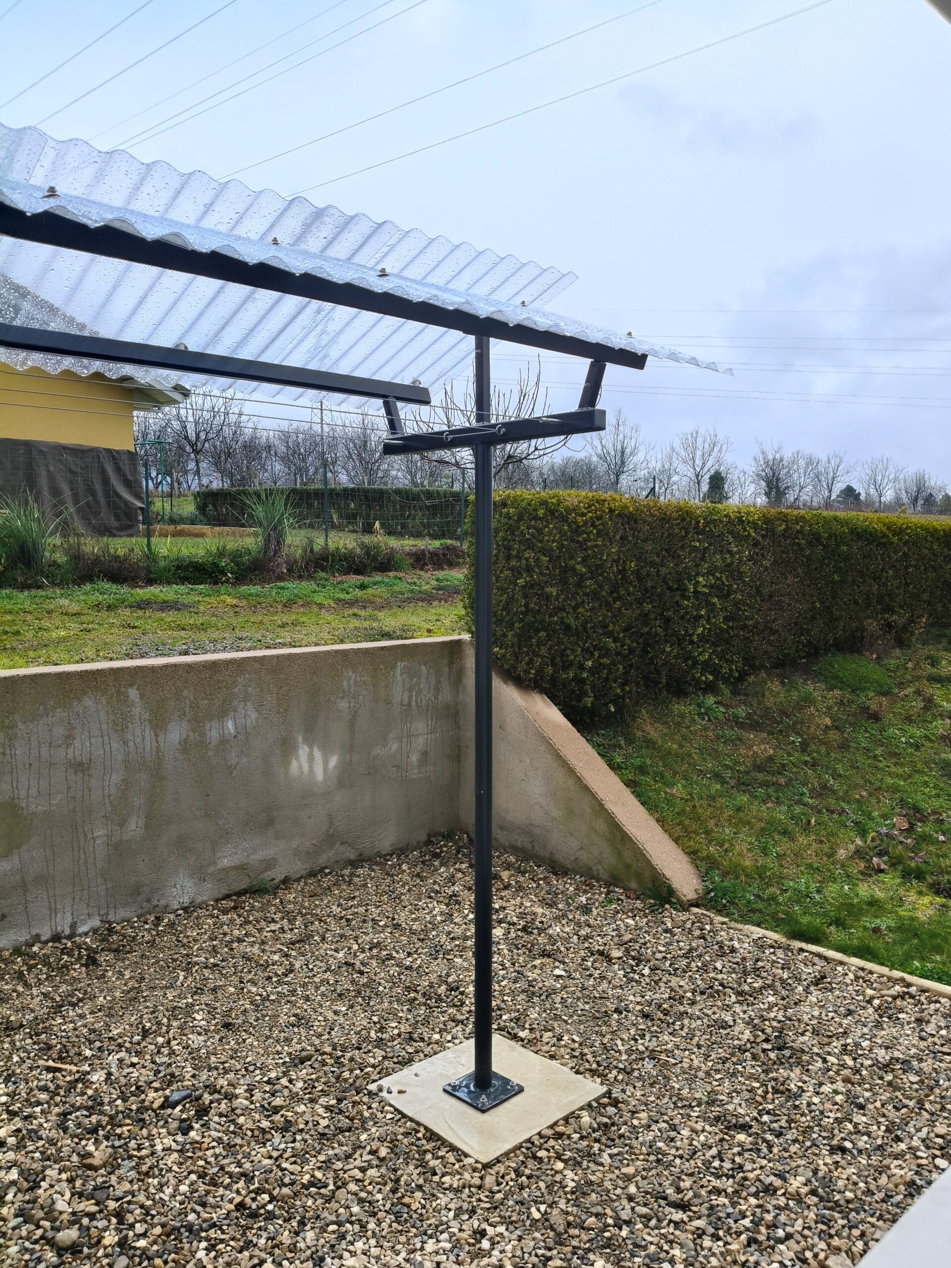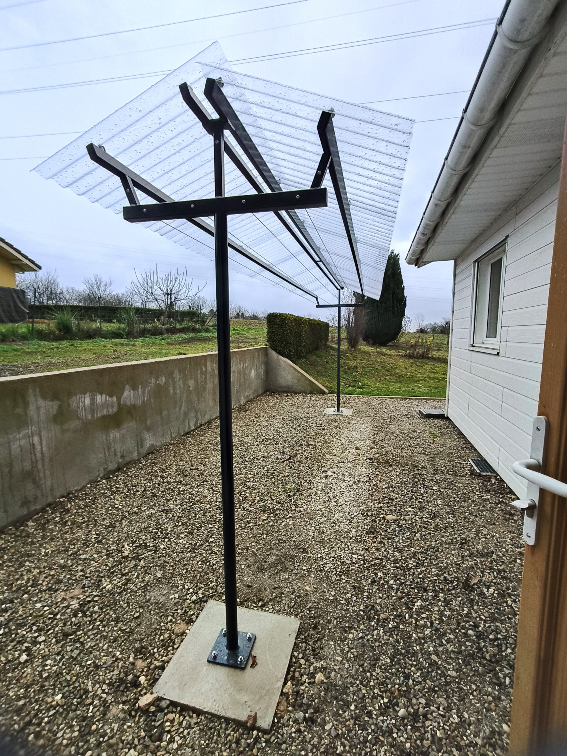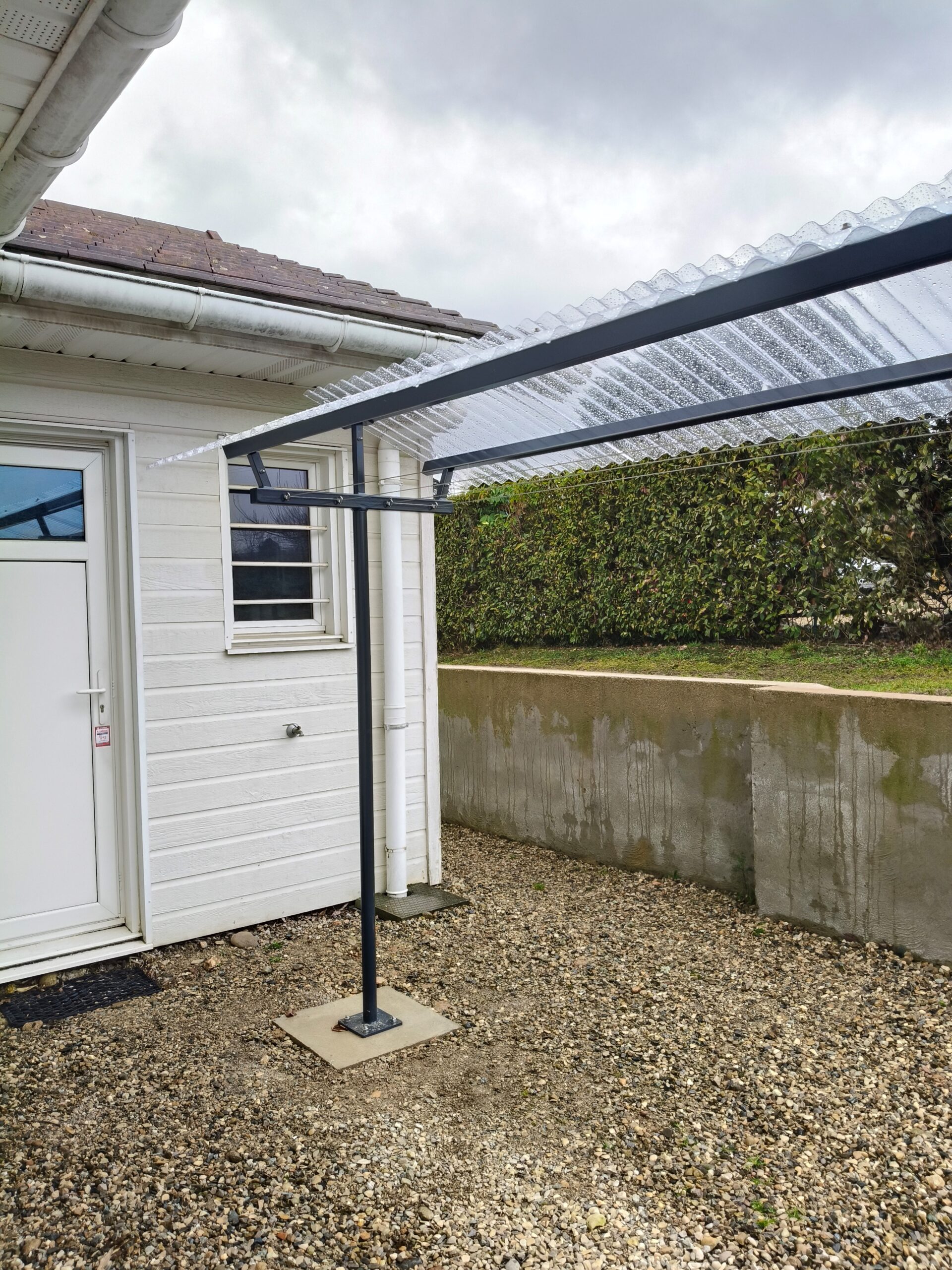 Suite à un déménagement, notre cliente souhaitait retrouver le confort d’un étendoir extérieur avec toit, comme dans son ancien logement. Face à l’absence de solutions adaptées sur le marché, elle s’est tournée vers le sur-mesure. Son besoin était précis : un étendoir robuste, parfaitement dimensionné, avec un toit en onduline transparente pour laisser passer la lumière sans gêner le sommeil de sa fille, dont la chambre se situe à proximité. Nous avons donc conçu une solution personnalisée, pensée pour s’intégrer harmonieusement à son environnement tout en répondant à ses contraintes du quotidien.